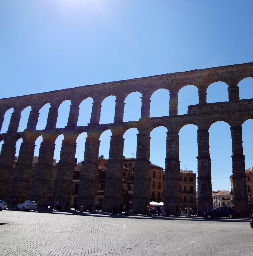 Segovia has a Roman aqueduct still in place and in great condition. The monumental size and engineering of the aqueduct is truly impressive to see. It was built with stones one on top of the other and no other adhesives.