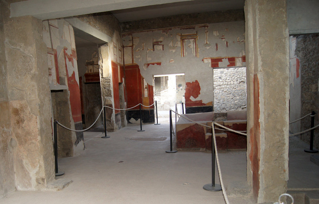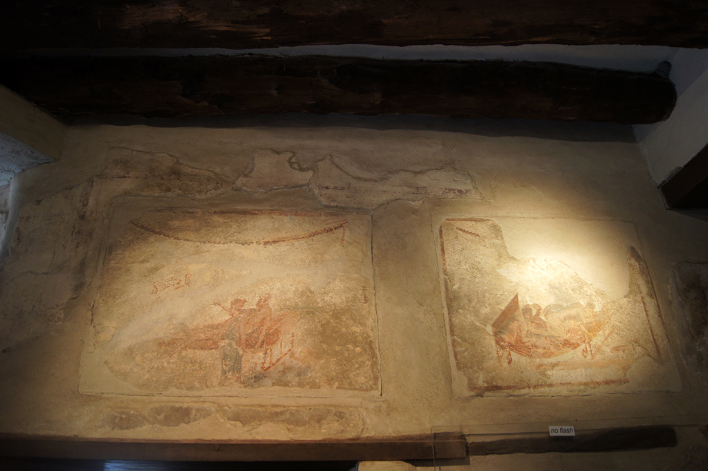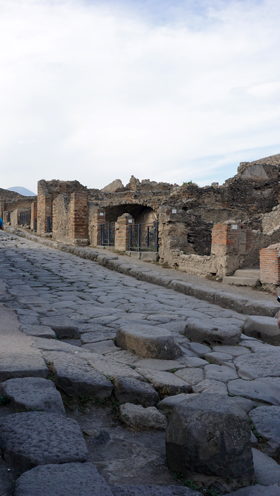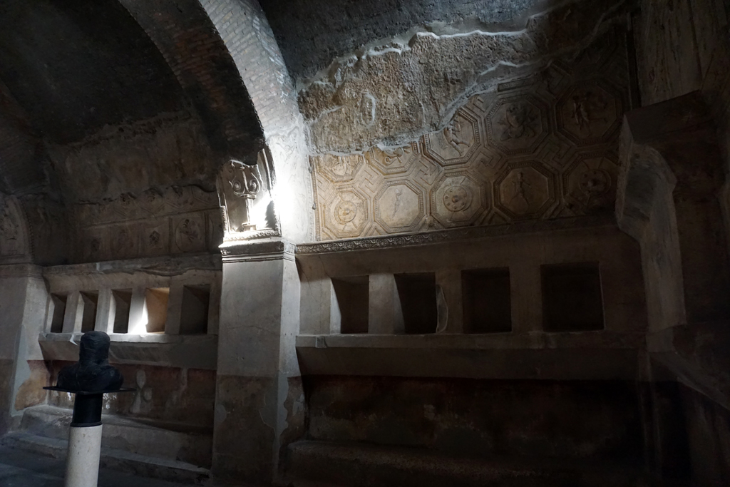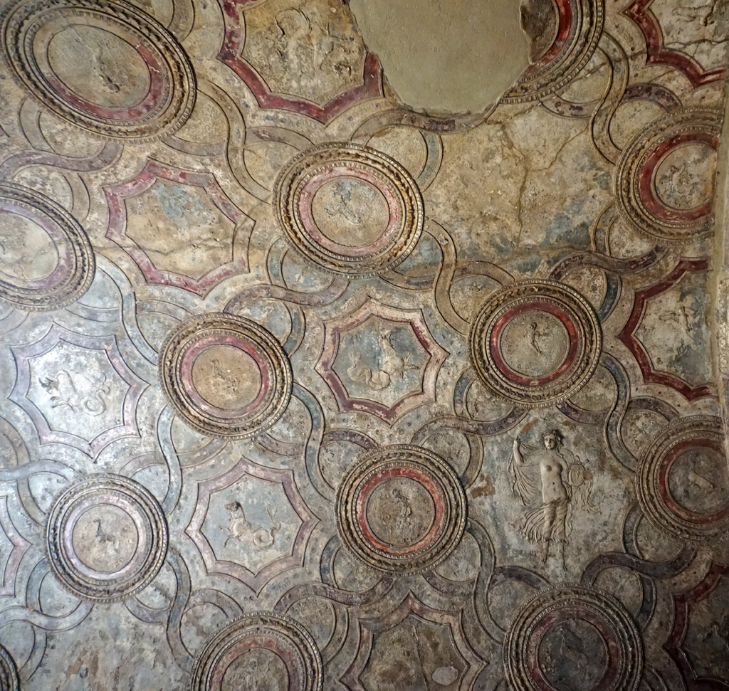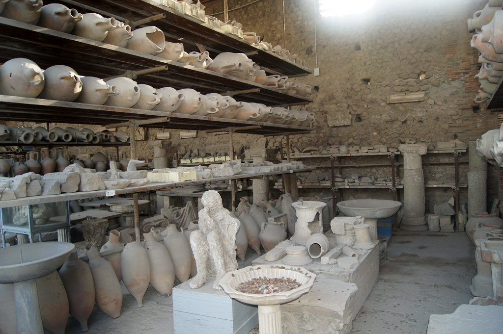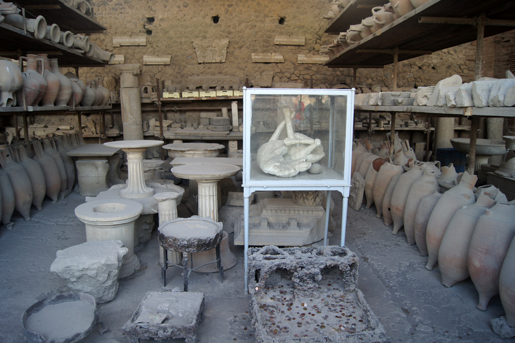 The best was saved for last! Our mini bus arrived in Pompeii. In Pompeii we got earphones and radio receivers to listen to our guide, she was fantastic! The entire group raved about her. She took us to the mini amphitheater, a shopkeeper’s store, a wealthy citizen’s house, the bathhouse (which was surprisingly well intact), a meeting area, and bordello, to name a few. She showed us how to find a bordello (by the penises on the ground), pointing to the left. One of the most interesting things is the citizens of Pompeii; they were preserved by a plaster/cement technique. On display at this time were a dog, a child, and a grown man (most of the sculpture people are on loan to other countries for exhibitions).