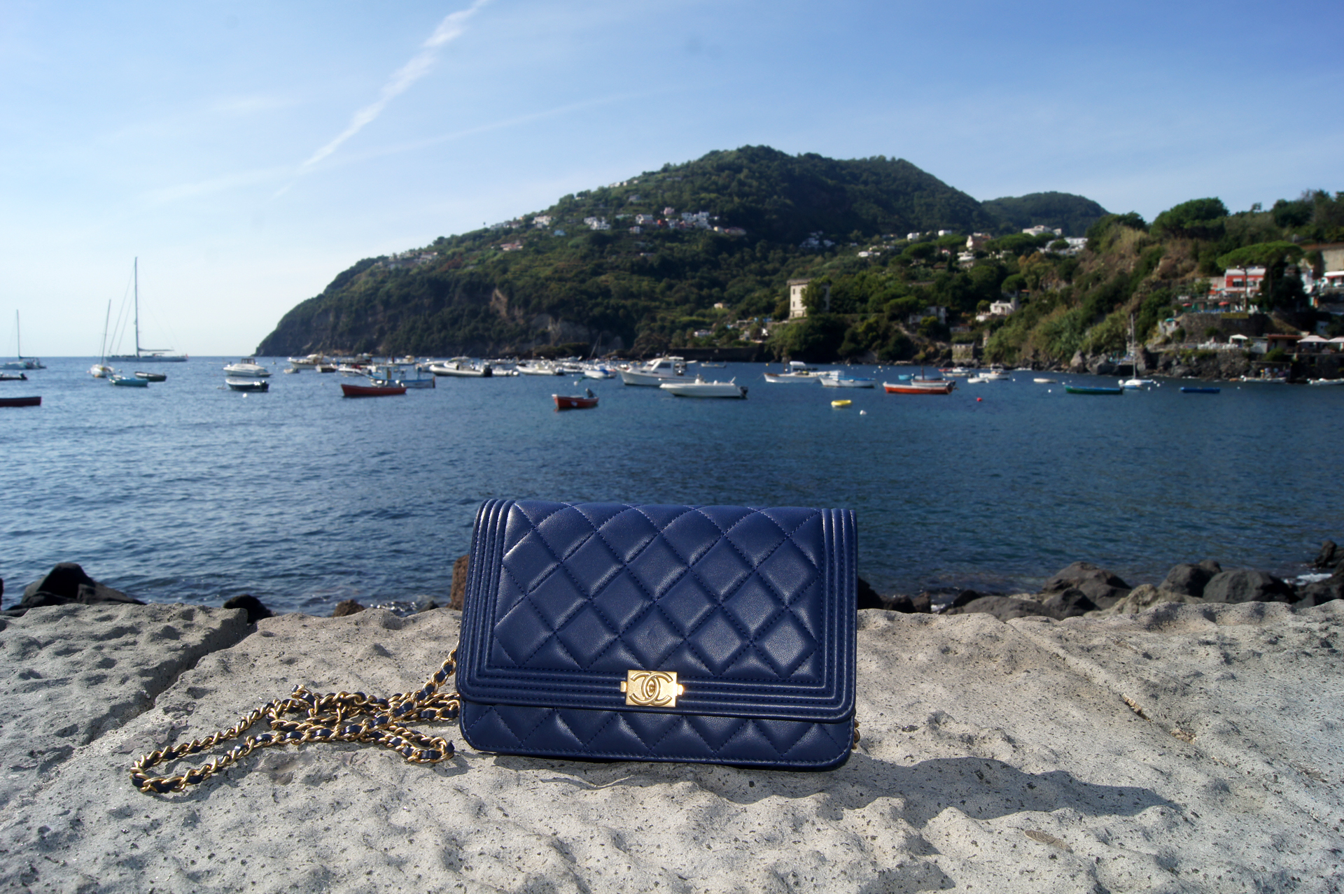 My accessory in Ischia, a blue and gold hardware Chanel wallet on a chain